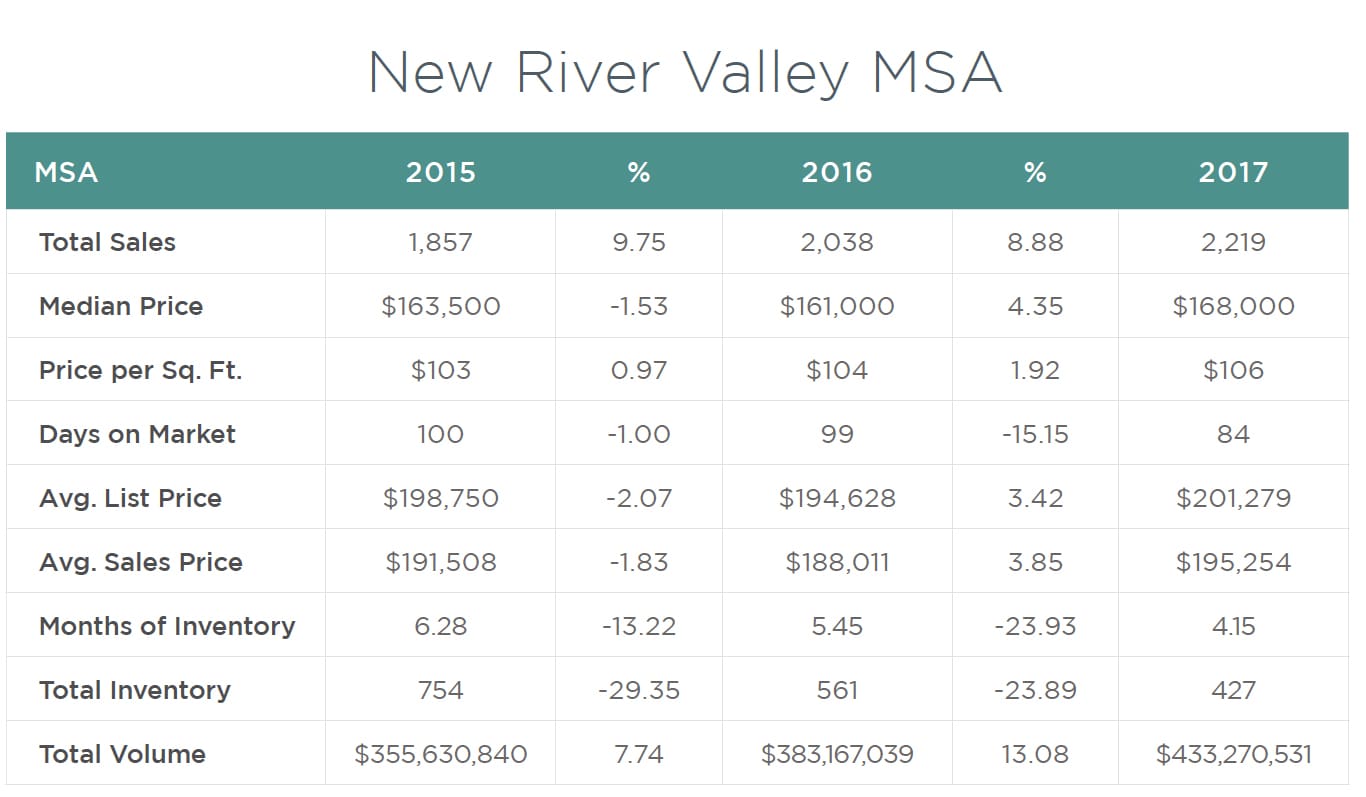The New River Valley continues to perform exceptionally well. After a decline in total sales in 2014, our market has seen three straight years of significant sales growth. Over the course of these three years, total sales have increased nearly 44%. Further, after a slight dip from 2015 to 2016, median sales prices in the NRV rose by more than 4% to $168,000 this past year, which is the highest median sales price over the last five years.