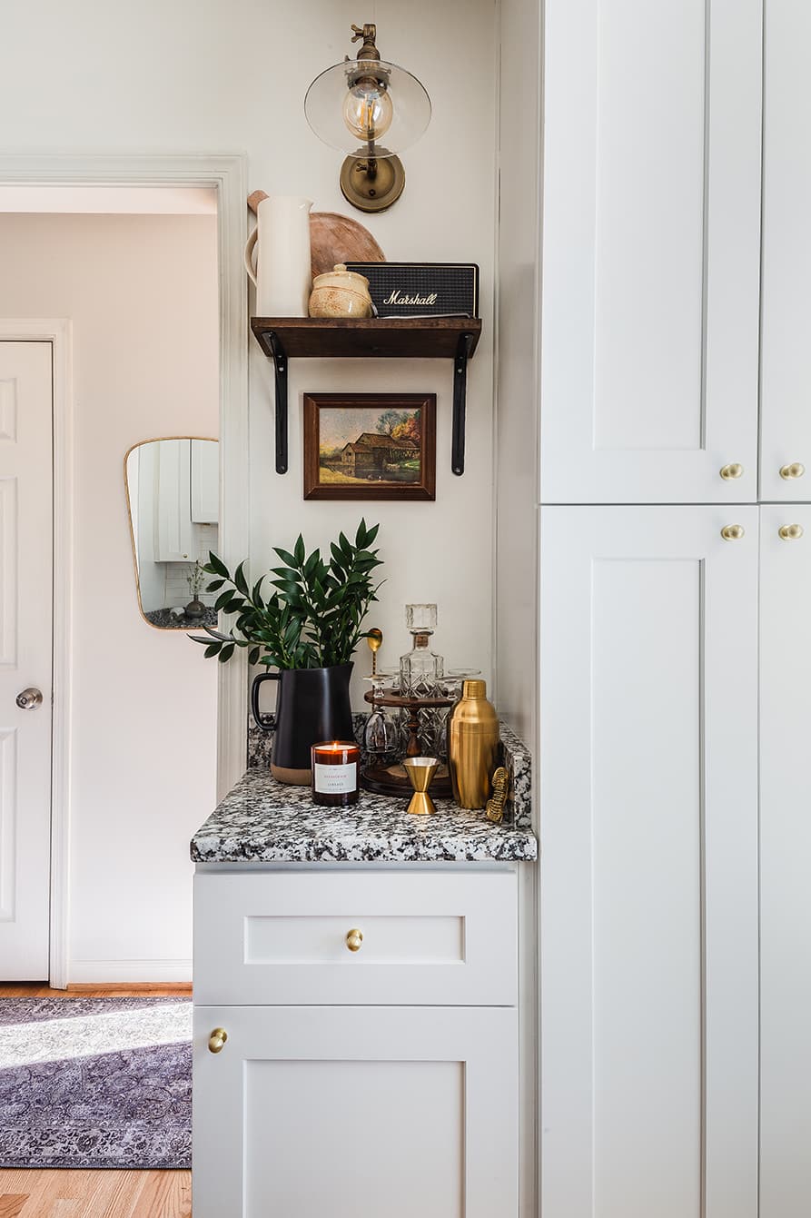 In the powder room, Wild Truffle by Behr dances on the walls. The effect is a jewel box of a room, an unexpected surprise. “By placing the art in a somewhat random spot, it feels elevated and different. It brings dignity to the room,” shares Billings.